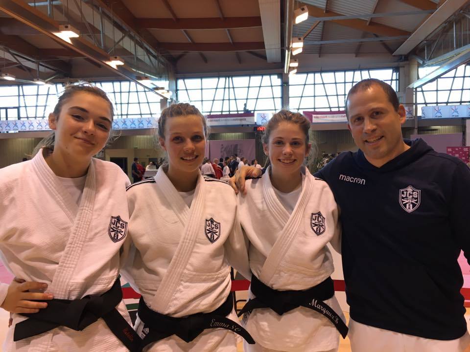 10 sélectionnés pour cette rencontre mais 3 absents(blessure,voyage scolaire...) Kevin Chevrier 7e Très Beau parcours de kevin qui s'impose par ippon au 1er tour,gagne sur décision au 2e tour,s'impose par ippon au 3e tour puis s'incline lors du 4e combat. Il y avait la place de remporter ce dernier combat mais c'est déjà un très beau résultat. Cet après-midi c'était au tour d'Estelle Mongabure,Emma Serres-Clarion et Margaux Basterreix d'entrer en jeu. Margaux et Emma finissent 5e en -52kg mais avec de gros regrets. En effet Margaux sort de poule puis s'impose en 1/32e, 1/16e et 1/8e avant de s'incliner en 1/4 sur une décision plus que litigieuse Emma réalise le même parcours que sa partenaire puis se fait surprendre en 1/4 contre la future championne. Dommage pour nos 2 guerrières car elles n'ont jamais touché la médaille d'aussi près Chez les -63kg Estelle a aussi été au charbon sortant de poule puis s'imposant en 1/32e avant d'échouer en 1/16e contre une solide adversaire. Bravo à nos 3 guerrières pour ce superbe parcours. Bilan de la journée Deux 5e places une 7e place Une 1/16e de finaliste